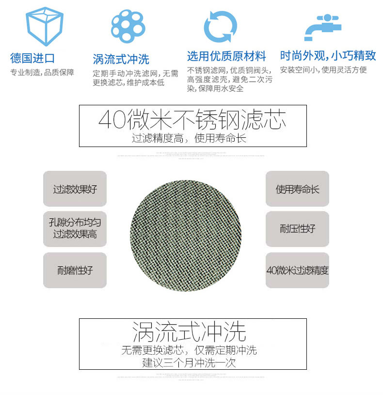 ● 渦流式?jīng)_洗,終身免換芯 ● 40微米過濾,能有效過濾雜質(zhì)、泥沙、鐵銹、蟲卵 ">